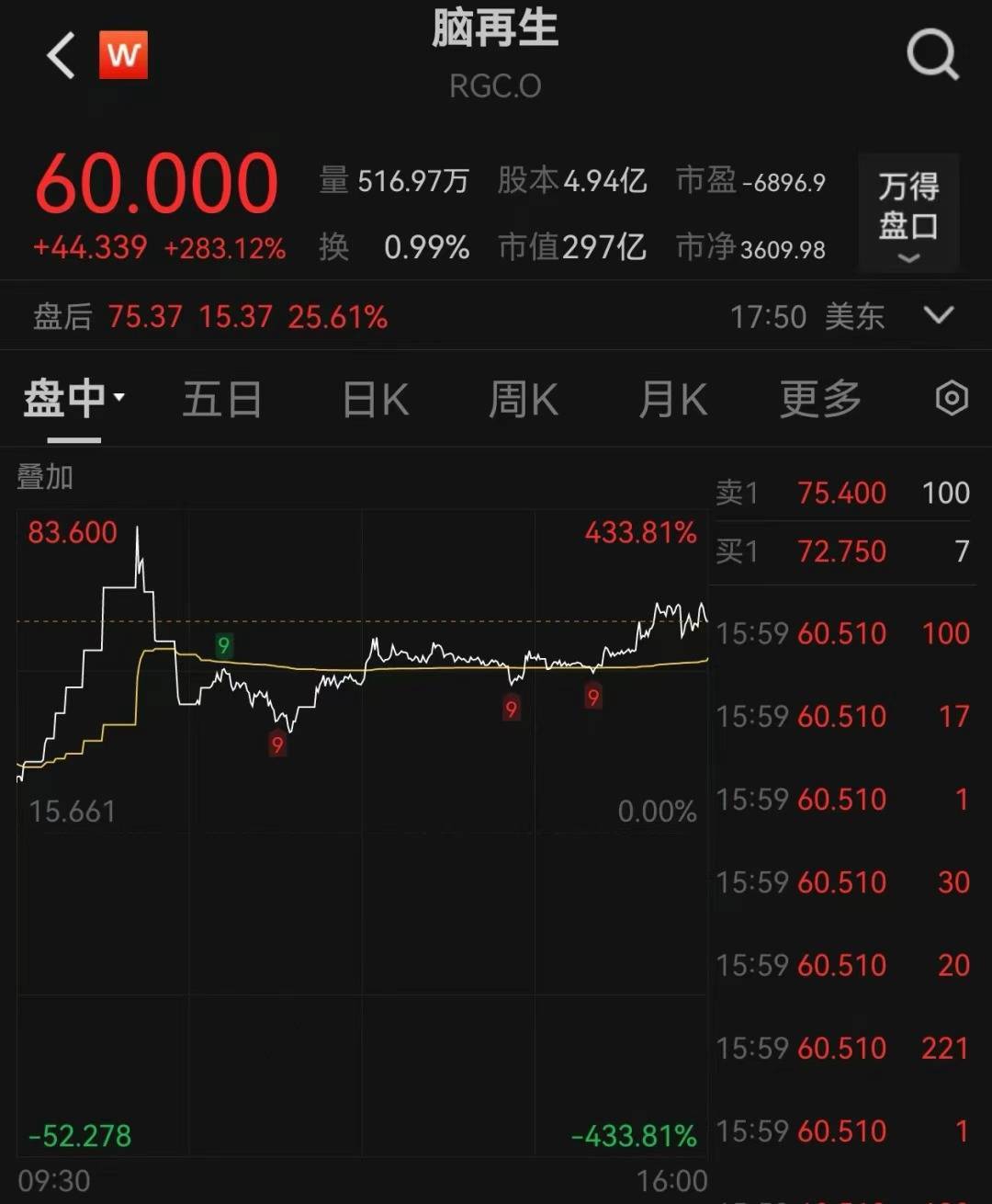 6月16日,在美上市的中概股公司脑再生科技(RGC.US)股价暴涨283%,盘中多次熔断,收报60美元,创下历史新高,总市值突破296亿美元,该股年内累计涨超50倍。Wind资料显示,脑再生是一家早期生物科学公司,专注于研究、开发和商业化治疗神经认知障碍和变性的中药,特别是注意缺陷多动障碍(ADHD)和自闭症谱系障碍(ASD)。此前公司宣布,将每股现有股份拆分为38股,拆分后的交易于6月16日进行。通常情况下,股票拆分是为了增强市场上公司普通股的流动性。